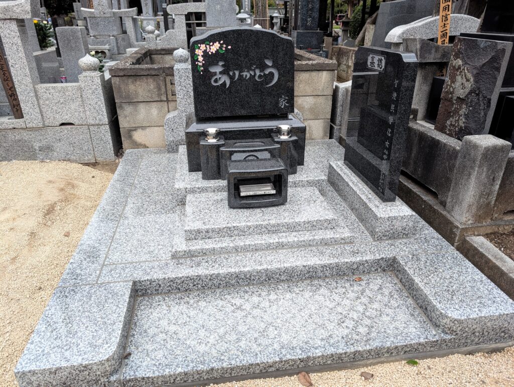 取手市の龍禅寺で、黒御影石を使った洋型墓石を新規に建立いたしました。正面には施主様の想いの「ありがとう」の文字。その左上に、当社からご提案もいたしまた、桜の彫刻を添え、黒御影の艶やかな質感にやさしい彩りを重ねています。全体は角を落とした丸みのある設計です。低い外柵とフラットな参拝スペースにより、毎日のお手入れがぐっと楽に。