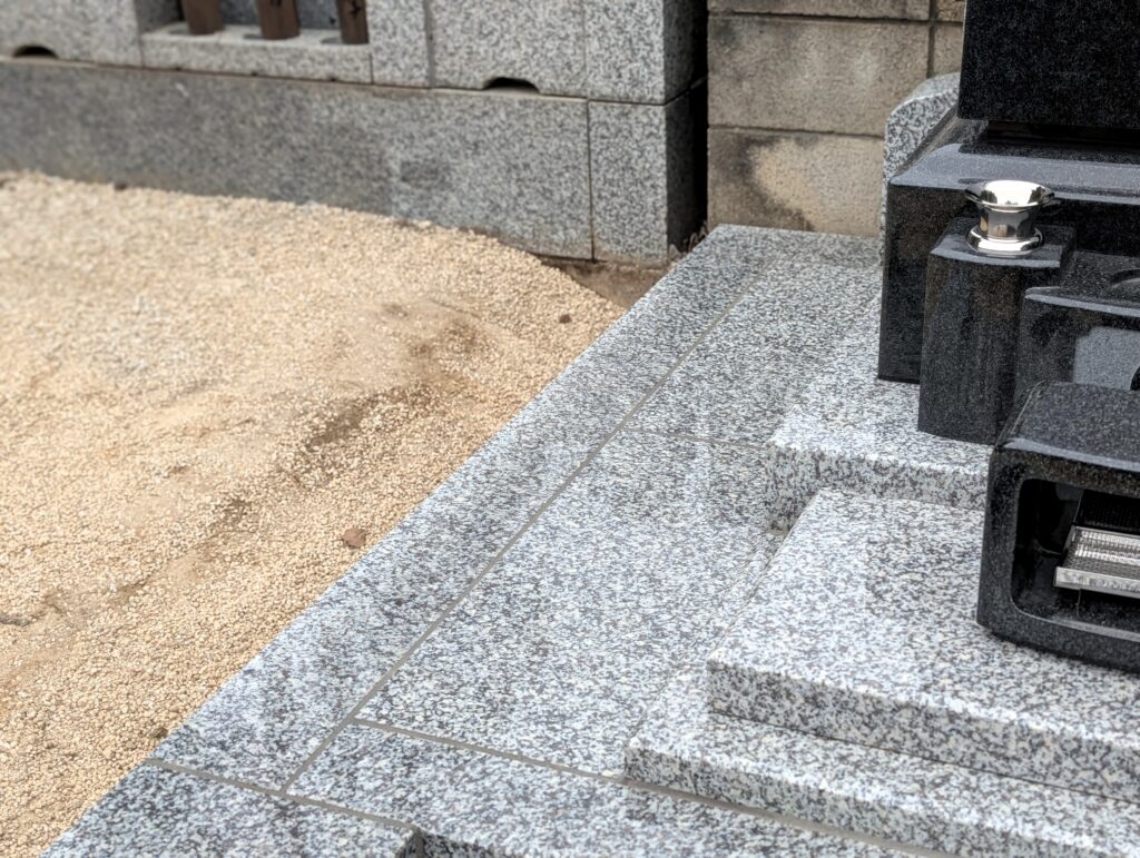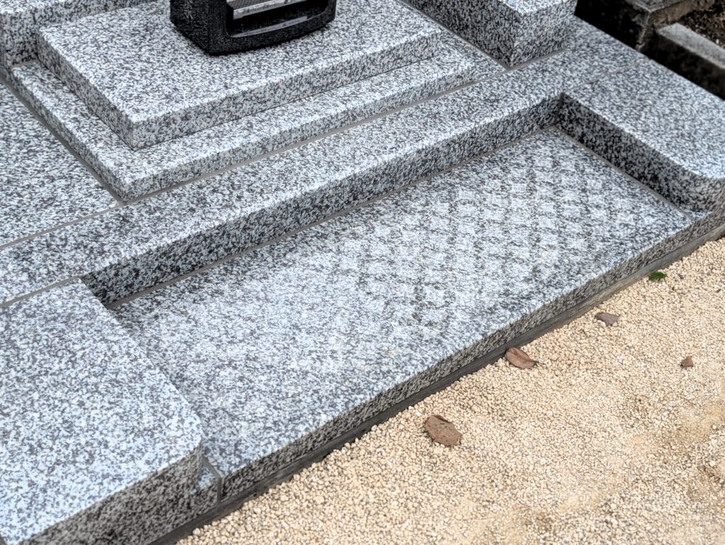 主碑前には広めのフラットスペースを確保。拝石手前の床面には滑りにくい加工(ブラスト加工)を施し、雨天時でも安心してお参りいただけます。低外柵と合わせることで、お供えや清掃の動きが自然に完結する、気持ちのよい参拝動線が生まれました。