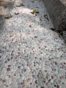 主碑前には広めのフラットスペースを確保。拝石手前の床面には滑りにくい加工(ブラスト加工)を施し、雨天時でも安心してお参りいただけます。低外柵と合わせることで、お供えや清掃の動きが自然に完結する、気持ちのよい参拝動線が生まれました。
