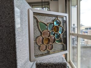 墓前灯籠 繊細な彫りが施され、夕刻にはロウソクの灯りが彫刻を柔らかく照らします。