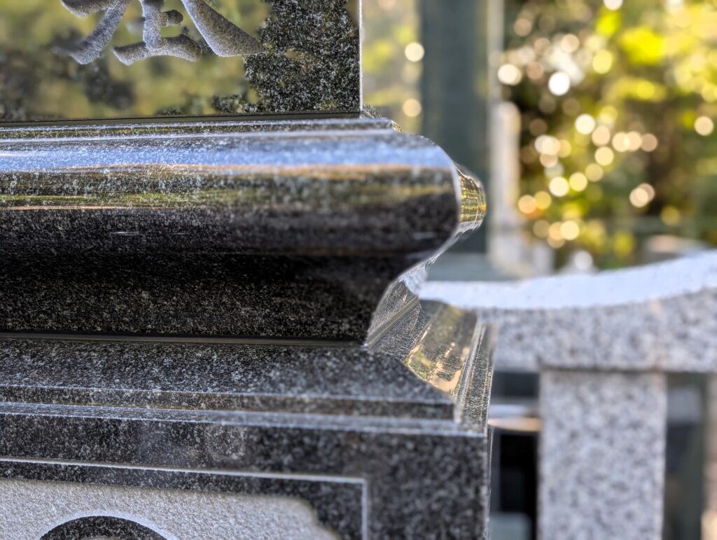 香箱加工を施した黒御影石の竿石 重厚感の中にも柔らかな陰影が生まれました。