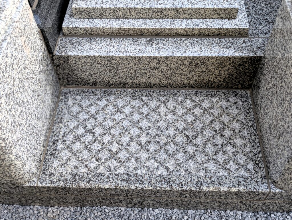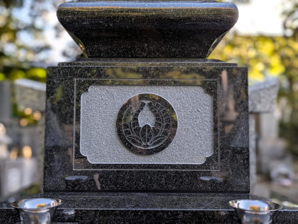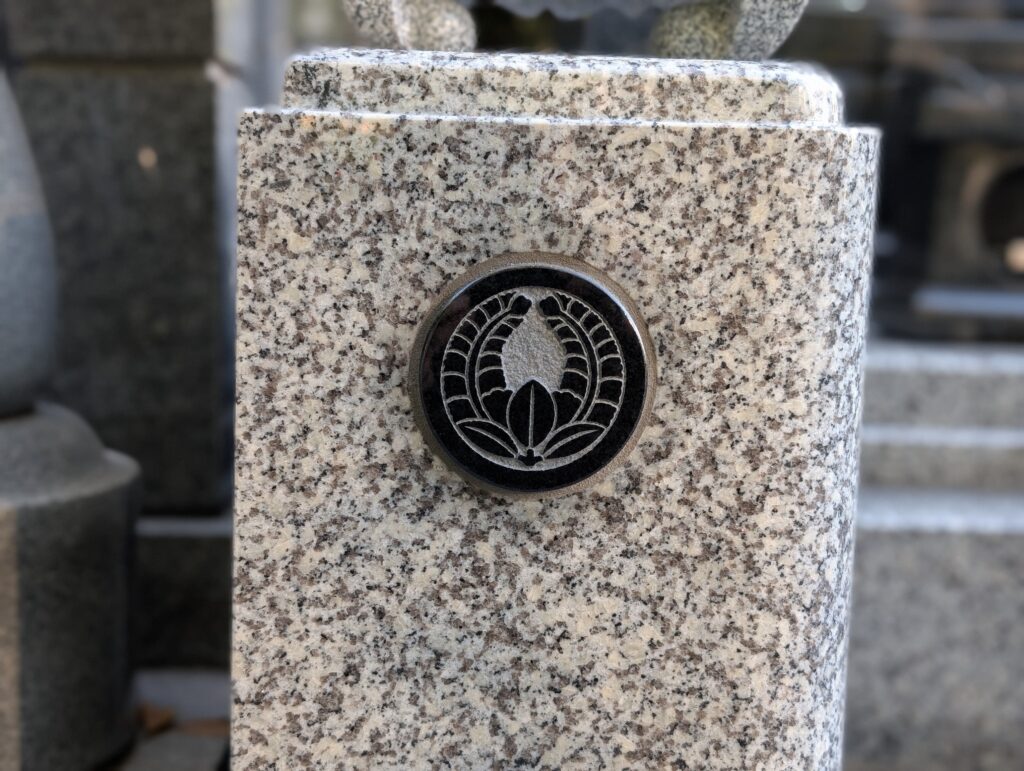 上台中央に彫刻されたご家紋 梨地仕上げの板石に家紋を深彫りすることで、陰影がくっきりと浮かび上がります。
