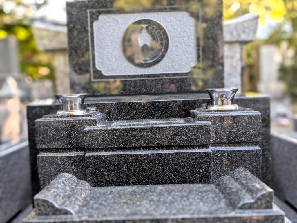 黒御影と白御影石を組み合わせた和型墓石は、重厚感と耐久性を兼ね備えた仕上がりとなりました。香箱・亀腹加工や一体型水鉢など、細部までこだわった意匠と実用性に施主様からもご満足のお声をいただいております。