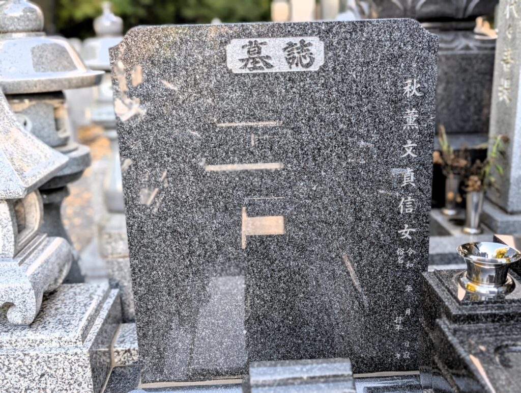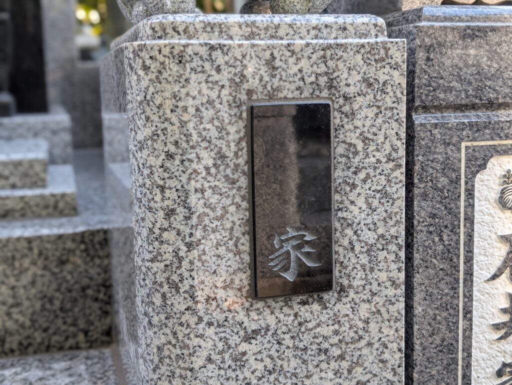 左側に設置した墓誌 正面の視線を遮らず、参拝動線を確保できる位置に配置しました。