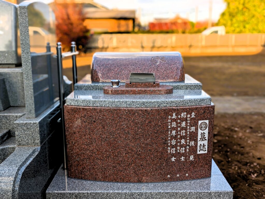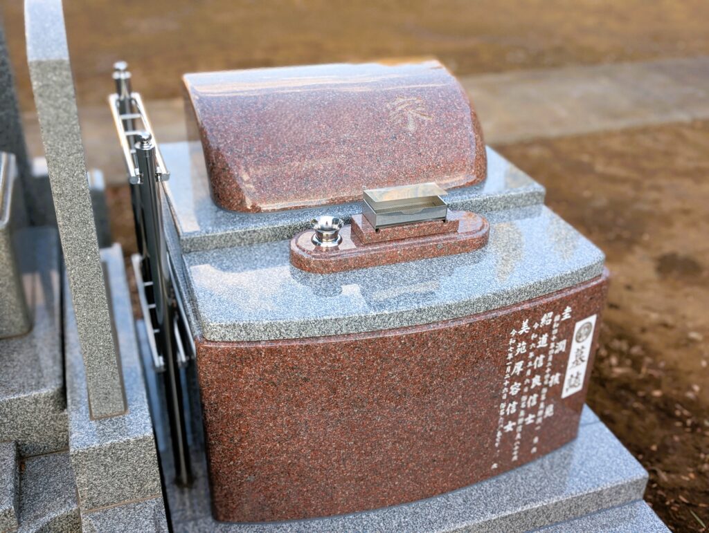 茨城県つくばみらい市の禅福寺様にて、当社オリジナルの洋型墓石シリーズ「さくらふわりぼ」の中から、丸みのあるデザインが特徴の「風」タイプを新規建立させていただきました。白の御影石と赤の御影石を組み合わせたツートンカラーで、これから長くご家族を見守っていく、明るくやさしい雰囲気のお墓です。