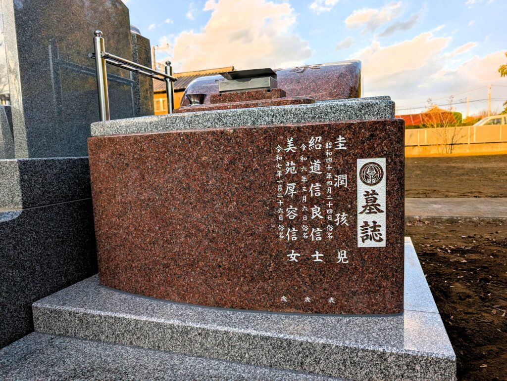 棹石と同じ赤御影石でつくった墓誌も、前面にやさしいカーブをつけたデザインです。ご家族のお名前や戒名を刻んだ部分は、読みやすさとバランスを大切にしながら、余白を残したレイアウトにしました。これからご家族が増えても、無理なく刻み足していけるよう配慮しています。
