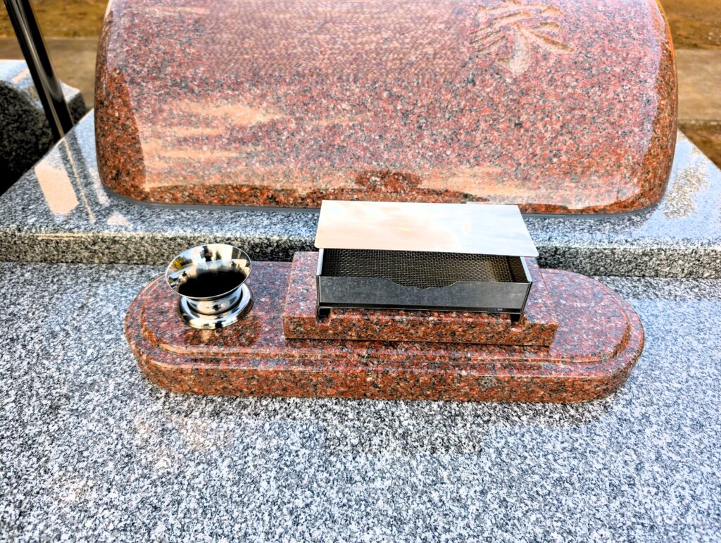 香炉・水鉢まわりのアップ。赤い御影石の上にステンレス製の香炉・花立を配置