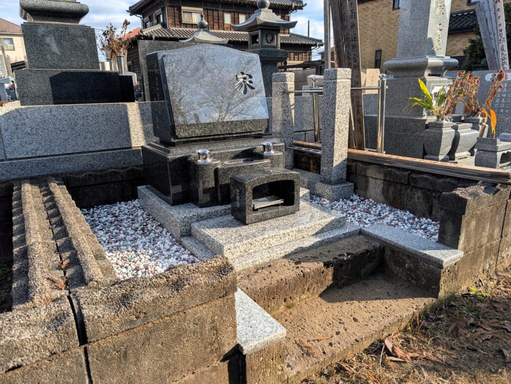 現地はすでに、カロート(納骨室)・大谷石の階段・ブロック外柵が整っている状態。施主様が当社の前をよく通られていて、展示が気になりお立ち寄りいただいたことがご縁となりました。