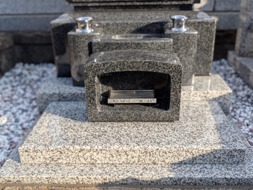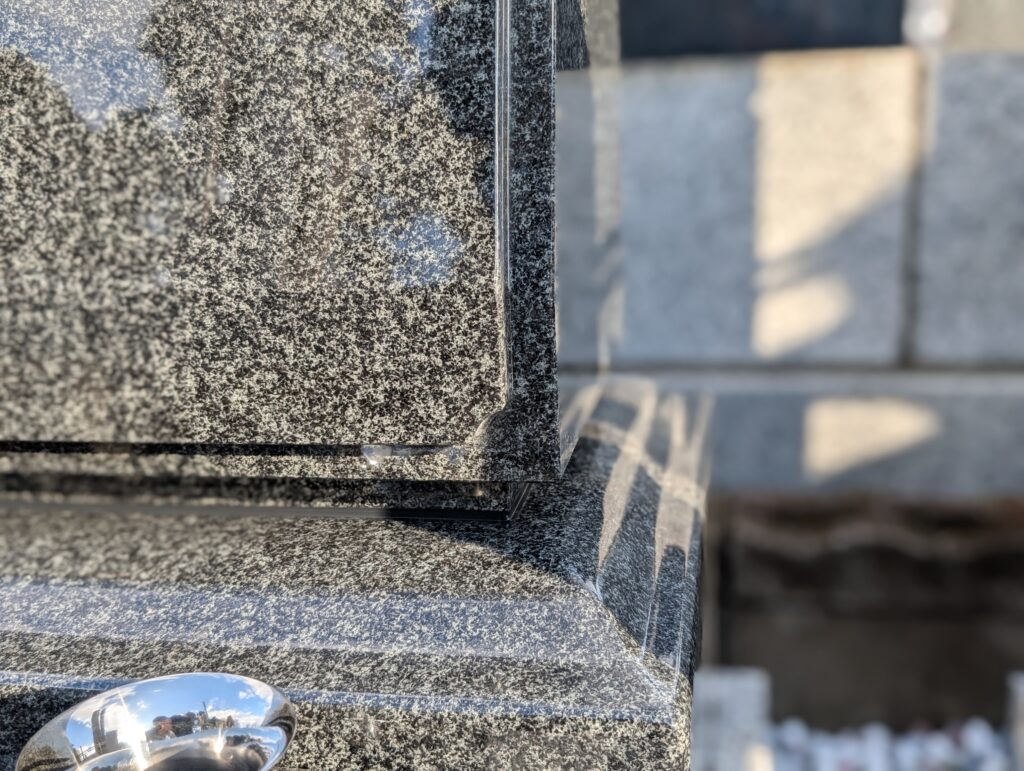 既存のカロートや階段、外柵がしっかりしている現場では、無理に壊すのではなく、良い部分を活かしながら新設部分をきれいに納めることが大切です。今回はまさにそのケースで、限られたスペースでも見栄えよく、お参りしやすい形を目指しました。