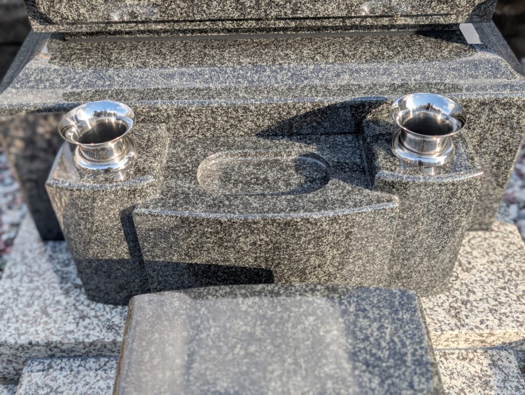 正面まわりは、花立(金物)を左右に配置し、中央に水鉢スペース。香炉も前に据えて、お参りの動作が自然に流れるレイアウトになっています。