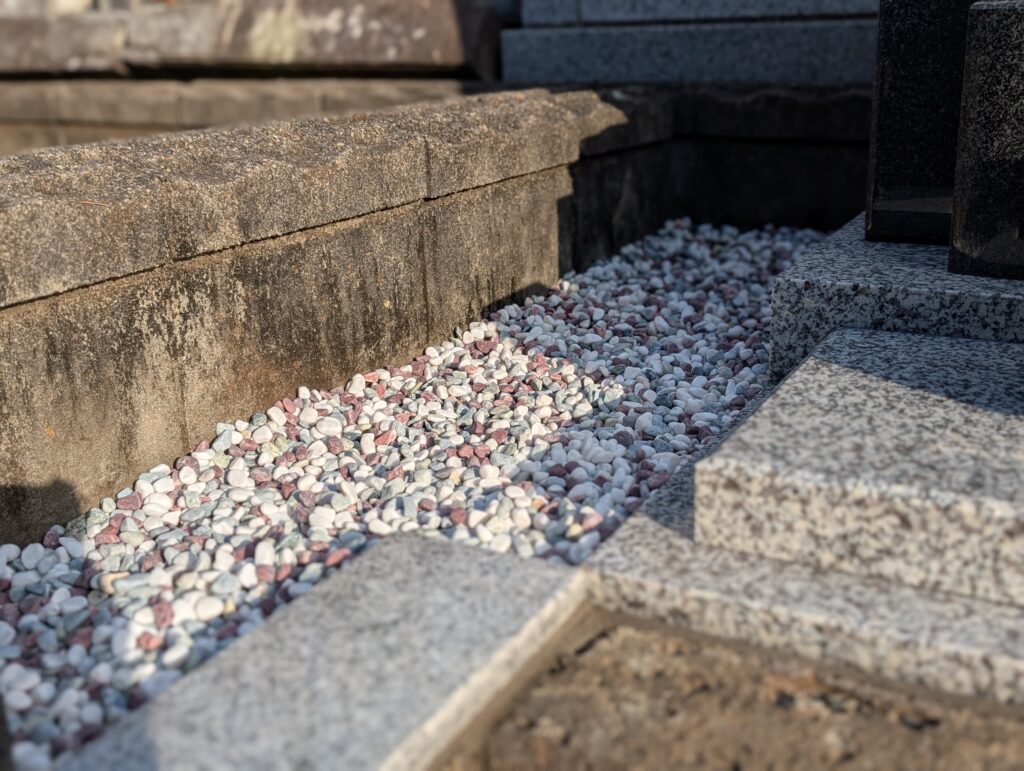 使いやすさを高める付帯工事:玉砂利追加・落下防止の板石・塔婆立て新設
