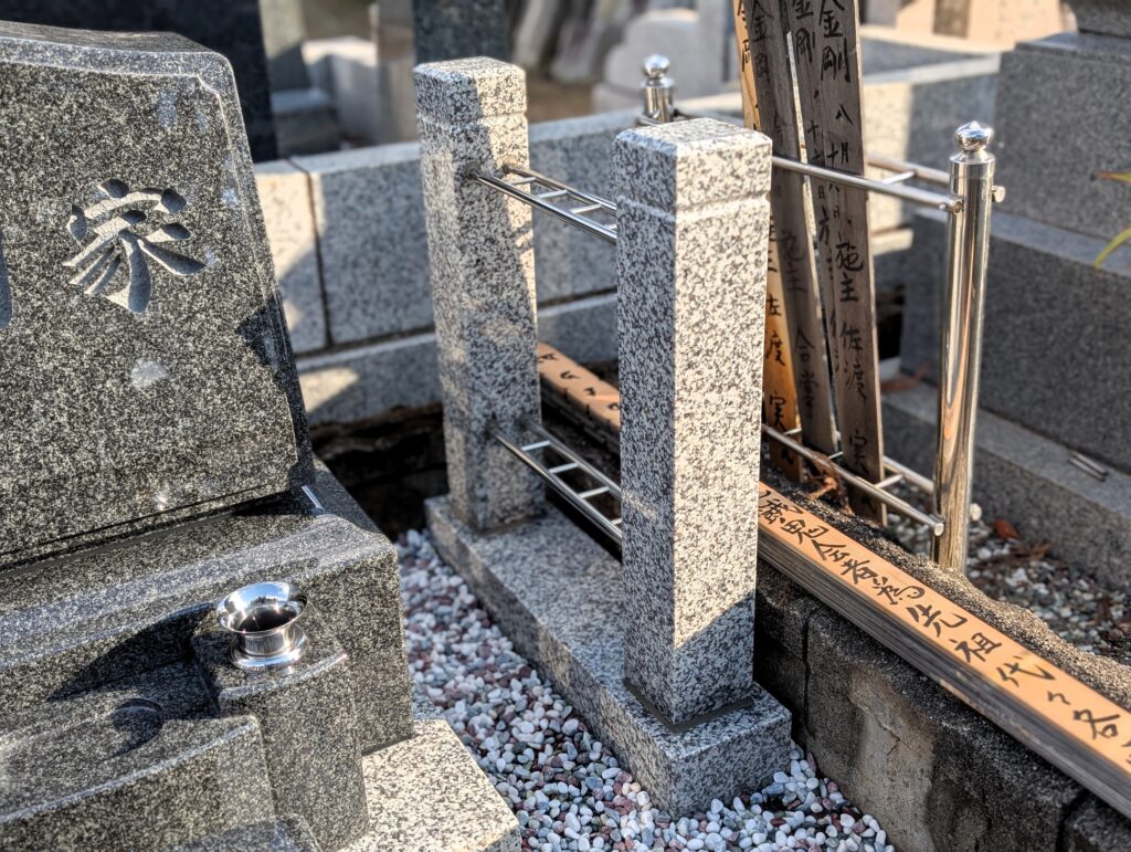 さらに、後方には塔婆立てを新設しました。御影石の柱とステンレス部材の組み合わせで、耐久性が高く、見た目もすっきりしています。