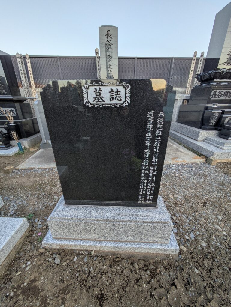 こちらが施工前の墓誌です。 すでに中央には「墓誌」の文字が彫られており、その周囲には額縁状の装飾が施された、非常にデザイン性の高い墓誌でした。