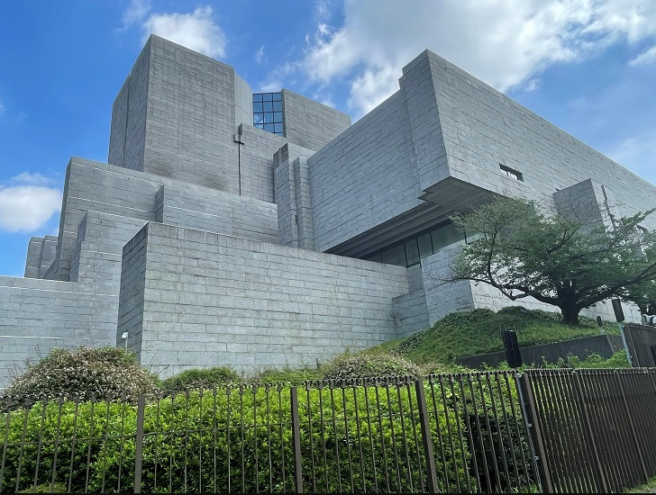 外は硬い顔、内は静かな顔。石材の見せ方が、そのまま建築の象徴となっています。