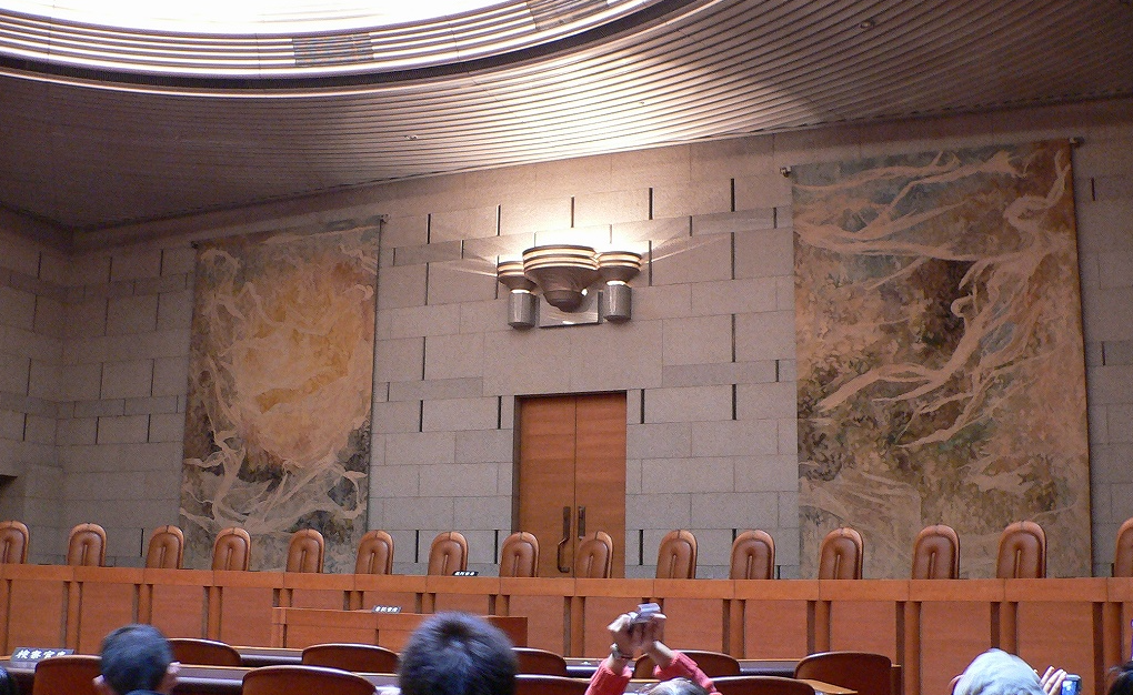 次に霞ヶ関へ。最高裁判所の建物を前にすると、稲田石は白くきれいな御影という印象だけではなくなります。見学用の資料には、外壁から建物内部へ続く石張りの壁に「茨城県稲田産の花崗岩(通称稲田みかげ)が使われ、外壁は割肌を生かした凸凹、内部に進むにつれて平滑で細かな仕上げへ移る」といった説明が載っています。