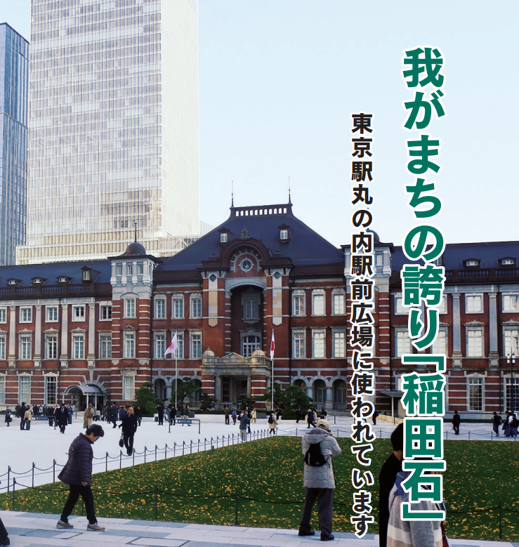 丸の内側に出て、駅前広場を歩くと、ひときわ白く光る石畳の帯に出会います。この白さに、稲田石が使われています。