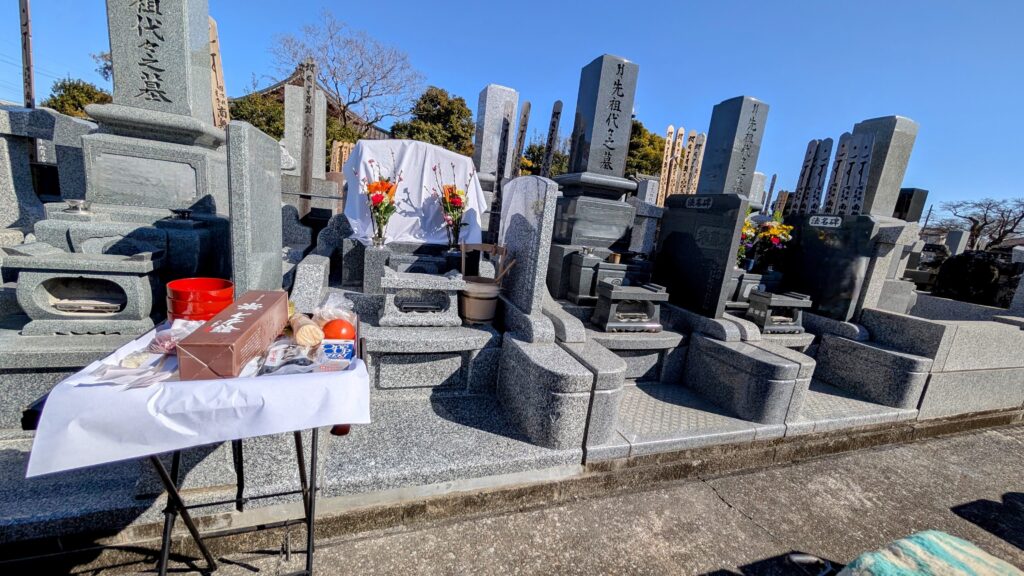 墓前で納骨の準備が整った様子(供花・お線香など)